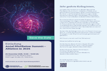 Nutzen Sie die Gelegenheit, sich mit Expert:innen aus dem In- und Ausland auszutauschen und zukünftige Strategien in der Rhythmustherapie gemeinsam zu gestalten. Save the Date Einladung Atrial Fibrillation Summit – Ablation in 2026 28. November 2025, 13:30 – 18:00 Uhr Josephinum der MedUni Wien, Währinger Straße 25, 1090 Wien