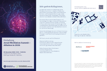 Nutzen Sie die Gelegenheit, sich mit Expert:innen aus dem In- und Ausland auszutauschen und zukünftige Strategien in der Rhythmustherapie gemeinsam zu gestalten. Save the Date Einladung Atrial Fibrillation Summit – Ablation in 2026 28. November 2025, 13:30 – 18:00 Uhr Josephinum der MedUni Wien, Währinger Straße 25, 1090 Wien